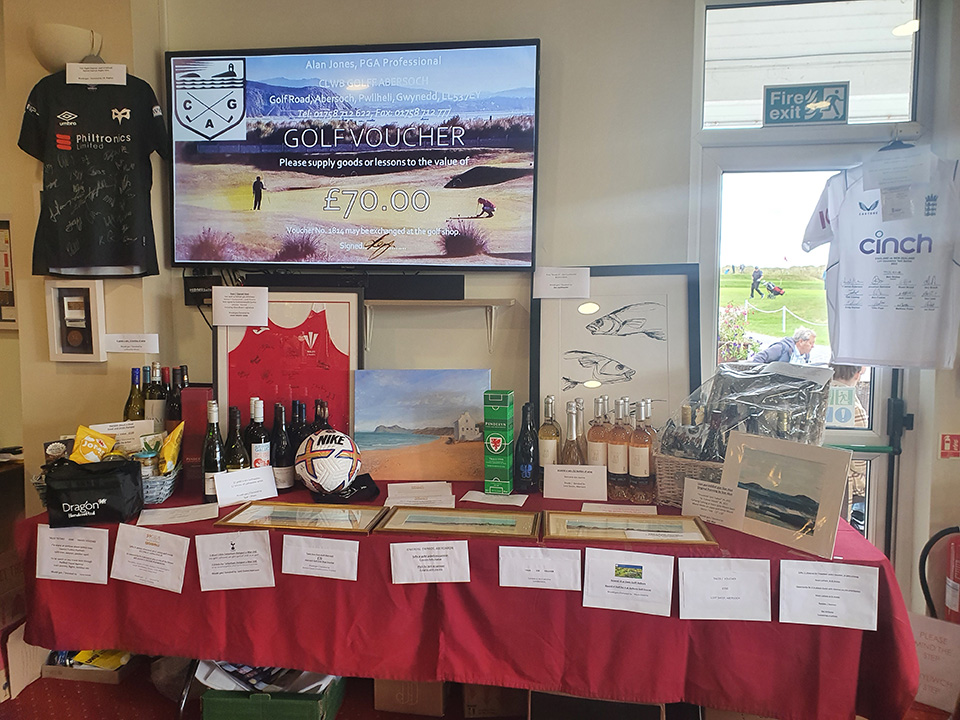 Voucher Glyn y Weddw - £80, Voucher Pwllheli Travel- £720, Ospreys Rugby Shirt (J.B.Hughes) - £60, Voucher Abersoch Golf Shop (Gerwyn Owen) - £80, Spurs v Man U Tickets (Lord Davies, Abersoch) - £500, Picnic Hamper for 4 (Chris Gierc) - £190, 59 Club (Williams a Roberts) - £410 (x2), 3 paintings of Abersoch Beach (J.B.Hughes) - £100, Golf for 4 at Astbury (Mark Gibbins) - £220, Gwersyll Dwyros - £70, Food and Drink Hamper (South Caernarfon Creameries) - £100, Painting of Morfa Nefyn Beach (Lauren Sapseid) - £210, Domaine des Jeanne Wines (Lord Davies, Abersoch) - £180, Bottle of Penderyn (Mike a Janet Davies)- £140, Painting by Sian Alun - £150, Laithwaites wines - £115, Print by Zoe Lewthwaite - £260, Wales Commonwealth Athletes Vest (Osian Dwyfor Jones) - £120, 12 Bottles of wine (Spar y Maes)- £200, Voucher Fresh - £130, Voucher Lost Sheep - £160, Golf for 2 at Royal Lytham (Dei Williams) - £310, Signed Cricket Shirt (Bwrdd Criced Lloegr a Cymru) - £190, B&B Voucher at Ty Newydd, Aberdaron - £210, 12 Official Match Balls Premier League - £120 each.